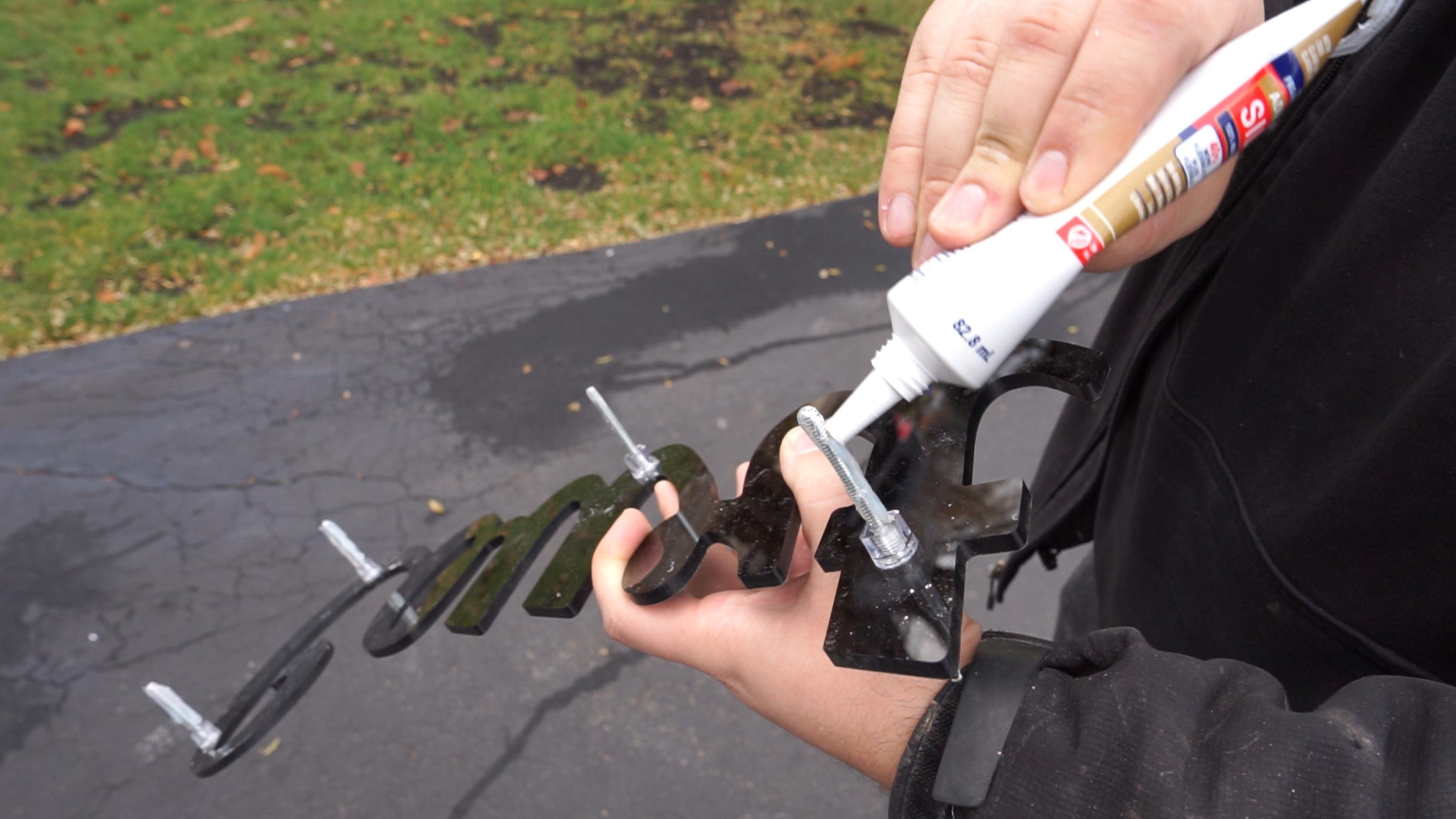 Using any all purpose outdoor caulk, apply a generous coating to the threaded rods and affix the sign to your installation surface.