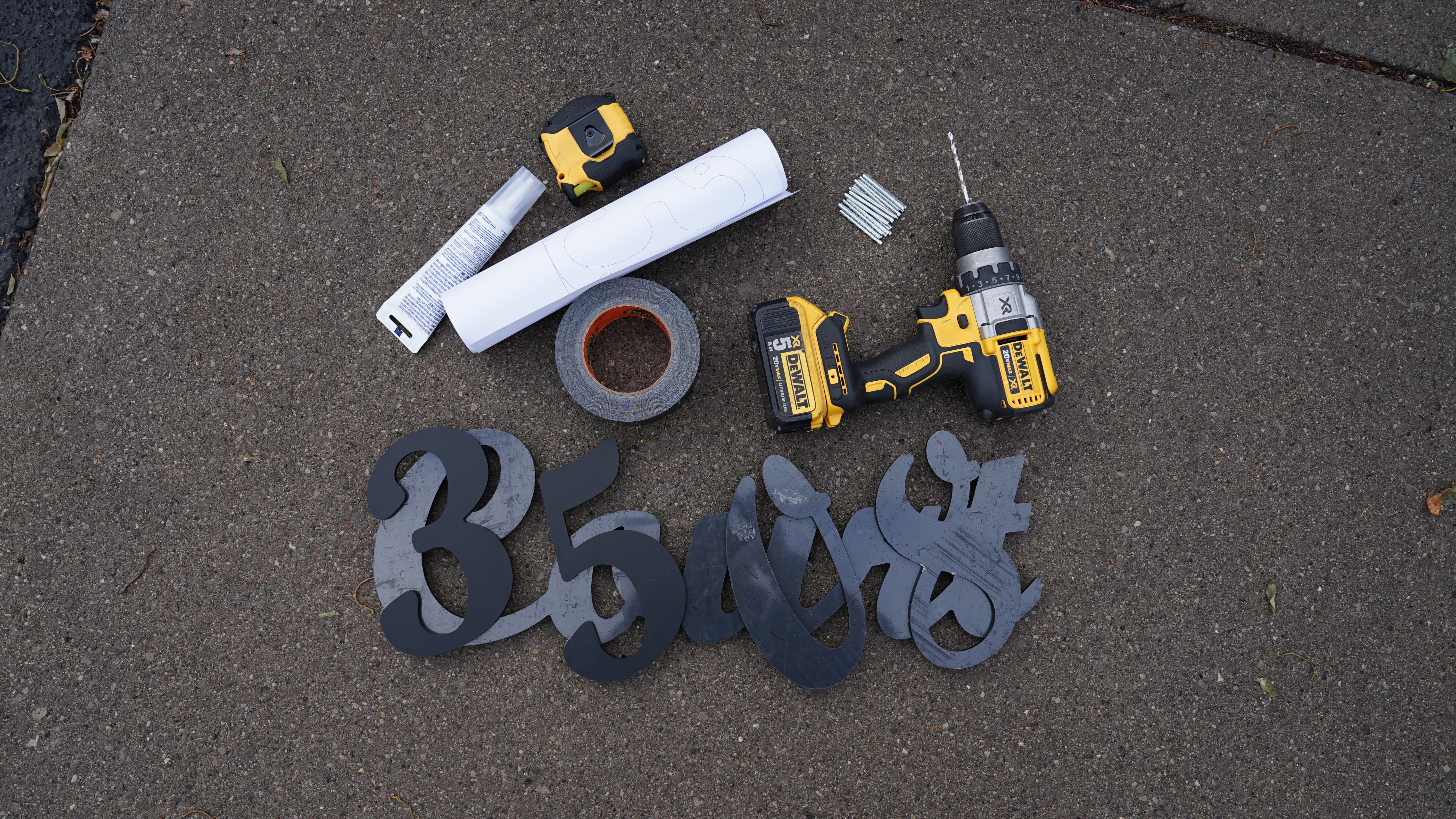 Gather supplies: house numbers, template, Threaded rods, (not included: tape, caulk, drill, Measuring tape). Masonry, concrete, and stone installations may require a hammer drill.